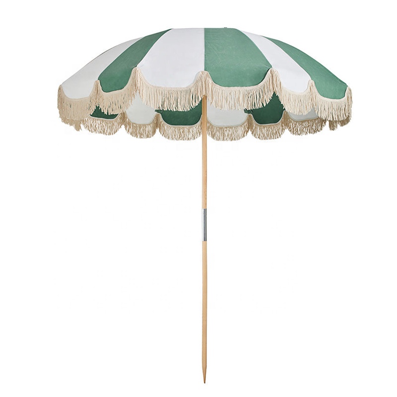 Biểu Tượng Tùy Chỉnh UV Bảo Vệ Oxford Vải Tán Thép Không Gỉ Ngoài Trời Mặt Trời Dù Bằng Gỗ Cực Thị Trường Bãi Biển Ô Với Fringe